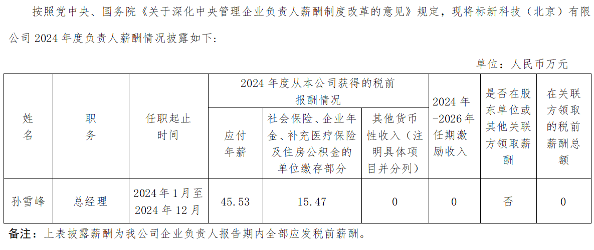 標新科技(北京)有限公司企業負責人2024年度薪酬情況