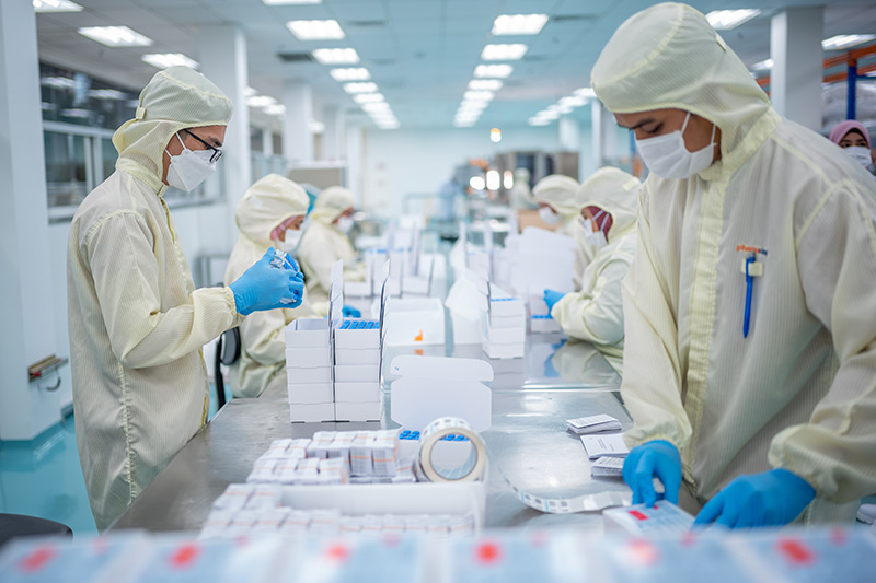 工人在馬來西亞吉隆坡郊區的發馬公司灌裝工廠包裝本地灌裝生產的科興疫苗(2021年10月5日攝)。新華社記者 朱煒 攝
