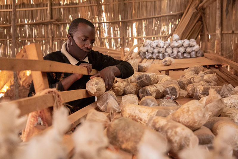 在盧旺達首都基加利的一家食用菌培育作坊,作坊主人埃馬紐埃爾·阿希馬納檢查菌袋(2020年9月9日攝)。中國福建農林大學的菌草專家2006年來到盧旺達開始菌草技術合作項目,在當地示范和推廣菌草技術。新華社發(西里爾·恩德格亞 攝)