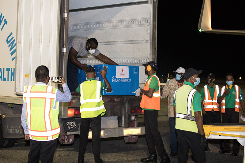 工作人員在圭亞那首都喬治敦國際機場搬運中國援助的新冠疫苗(2021年3月2日攝)。新華社發(圭亞那新聞署供圖)