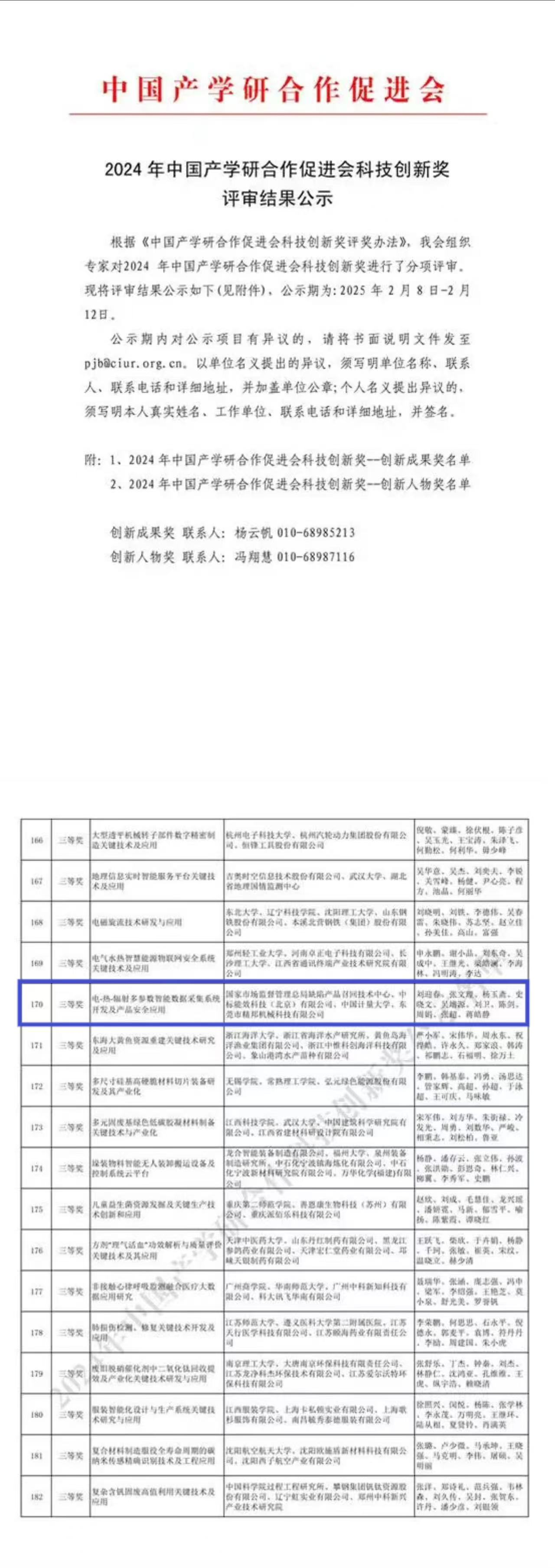 近日,2024年中國(guó)產(chǎn)學(xué)研合作促進(jìn)會(huì)科技創(chuàng)新獎(jiǎng)評(píng)審結(jié)果正式公布。由國(guó)家市場(chǎng)監(jiān)督管理總局缺陷產(chǎn)品召回技術(shù)中心、中標(biāo)能效科技(北京)有限公司、中國(guó)計(jì)量大學(xué)、東莞市精邦機(jī)械科技有限公司聯(lián)合完成的“電-熱-輻射多參數(shù)智能數(shù)據(jù)采集系統(tǒng)開發(fā)及產(chǎn)品安全應(yīng)用”項(xiàng)目榮獲創(chuàng)新成果獎(jiǎng)三等獎(jiǎng),充分體現(xiàn)了項(xiàng)目團(tuán)隊(duì)創(chuàng)新能力與產(chǎn)品安全領(lǐng)域技術(shù)能力。