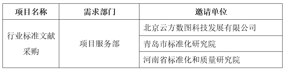 按照《標新科技(北京)有限公司采購工作管理辦法(試行)》要求,現(xiàn)對“行業(yè)標準文獻采購”項目競爭性談判邀請單位進行公示。